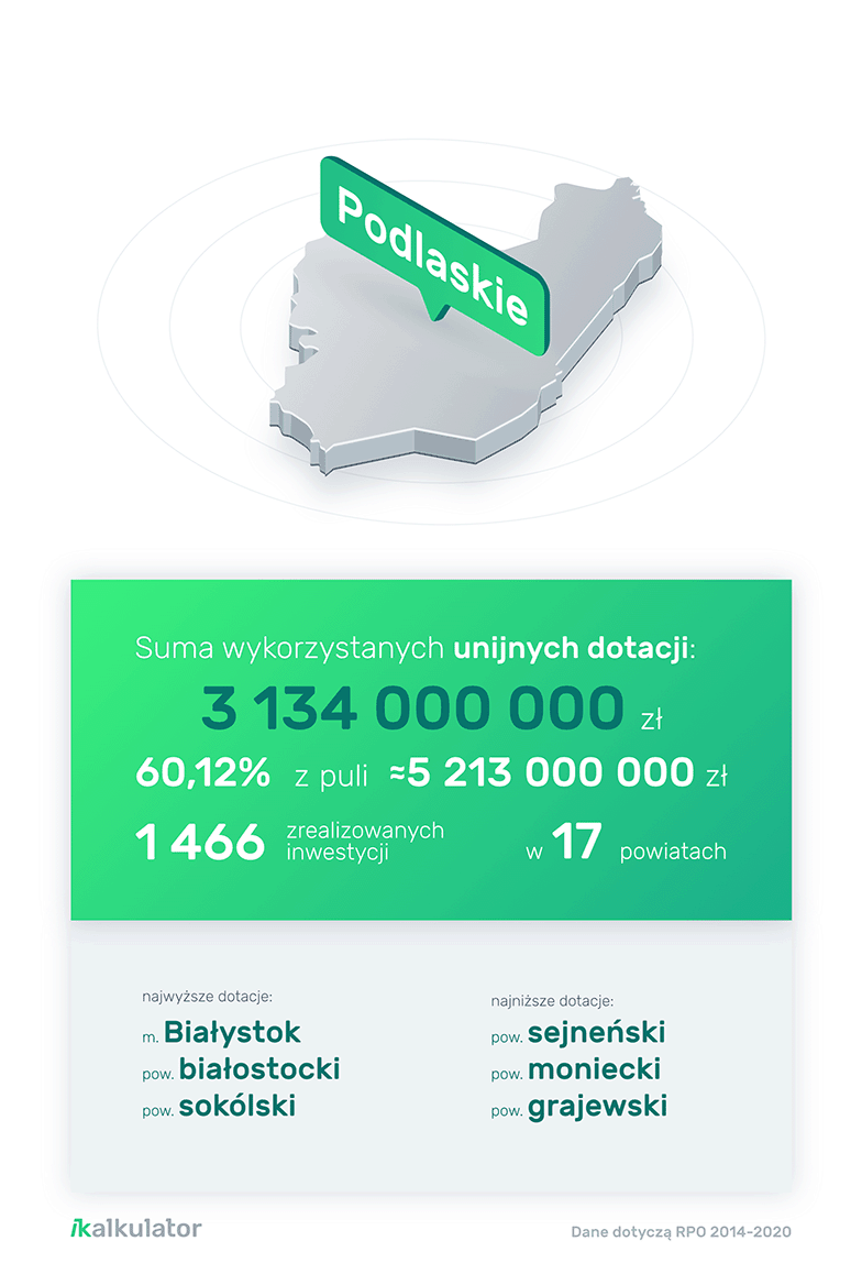Województwo podlaskie na realizację Regionalnego Programu Operacyjnego otrzymało 1,2 mld euro, czyli ok. 5,2 mld zł. Z tych środków rozdysponowano już dokładnie 60,12 proc. To trzeci najsłabszy wynik w kraju – mniej skutecznie unijnymi dopłatami zarządzają tylko województwa warmińsko-mazurskie i kujawsko-pomorskie. Władze regionu do tej pory rozdzieliły ok. 3,1 mld zł, a dofinansowania popłynęły do blisko 1,5 tys. projektów.