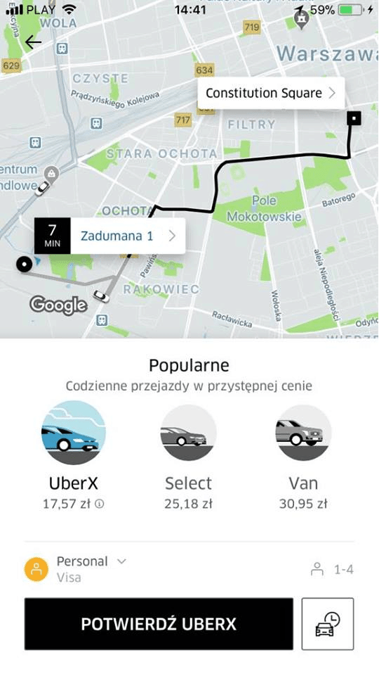 - Wybierz rodzaj pojazdu: UberX (standardowy samochód), UberSelect (samochód wyższej klasy) lub Van.
